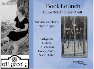 It is thus not surprising that the launch of The Hospitality of Trees will take place among the trees in full autumn colour around Gillygooly Gallery. In addition, the John Geary duet will play live jazz music and the painting by local artist Trevor McKinven which graces the book’s cover will be on display. The launch is free, and everyone is welcome. Copies of The Hospitality of Trees may be purchased on-site for $20.
