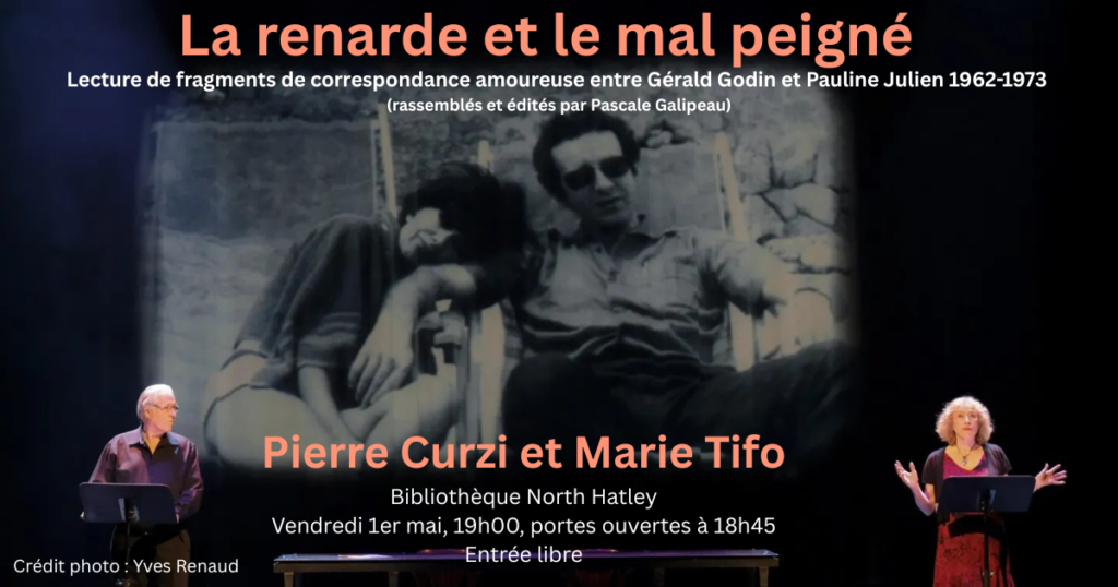 On Friday evening, May 1st, at the North Hatley Library, there will be a reading of excerpts from the correspondence between Pauline Julien and Gérald Godin. These letters are taken from ”La renarde et le mal peigné”, a collection of letters selected, compiled, and published by Pascale Galipeau. She has kindly granted actors Marie Tifo and Pierre Curzi permission to hold a free public reading.